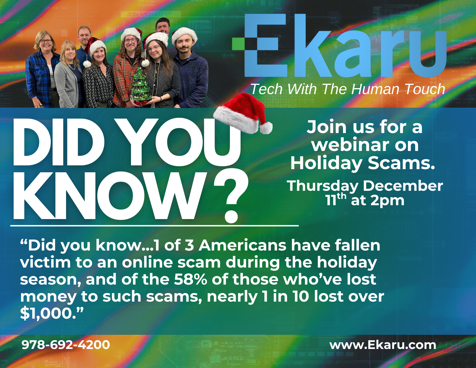Join Ekaru for a workshop on Thursday December 11th at 2pm EST. We're pleased to be bringing you the latest new info! Join us Thursday to talk about "Don’t Get Scammed: Cyber Threats Every Business Should Watch This Holiday Season.