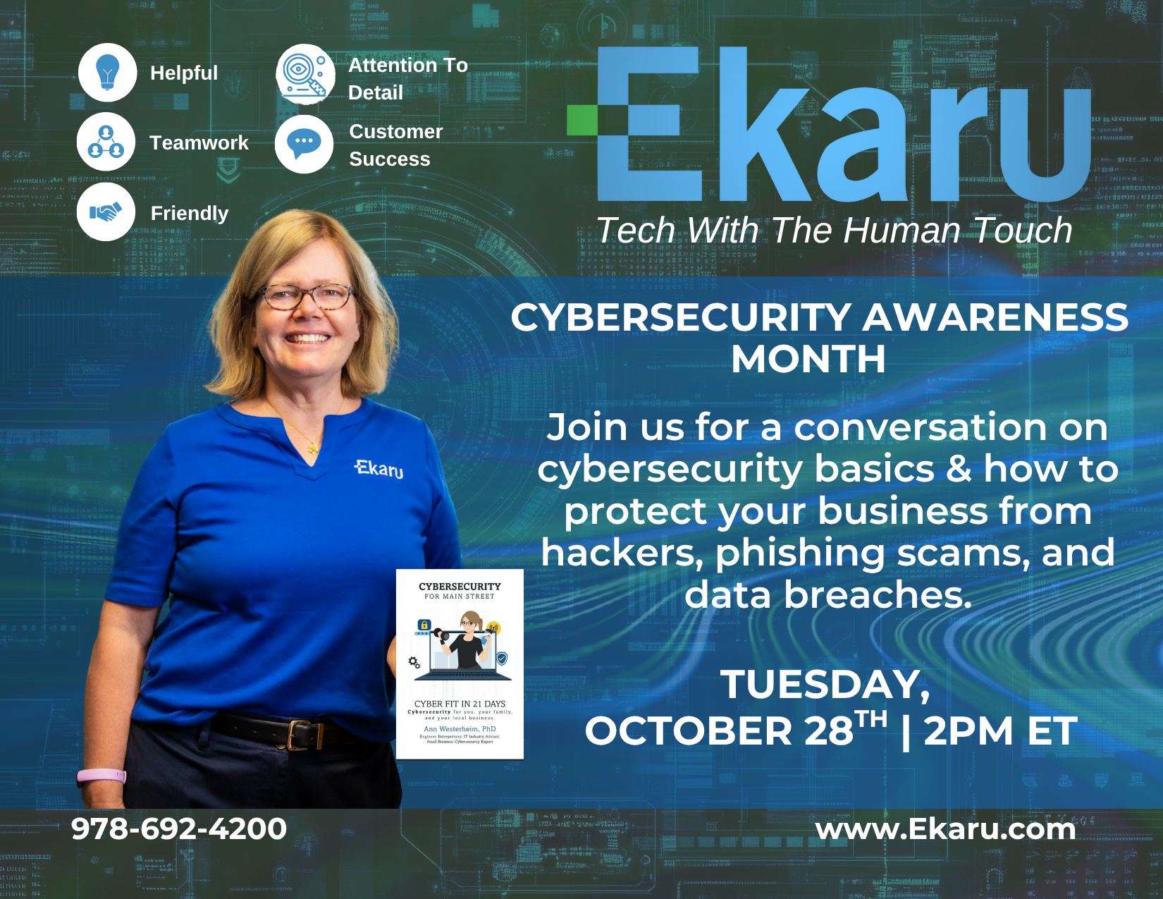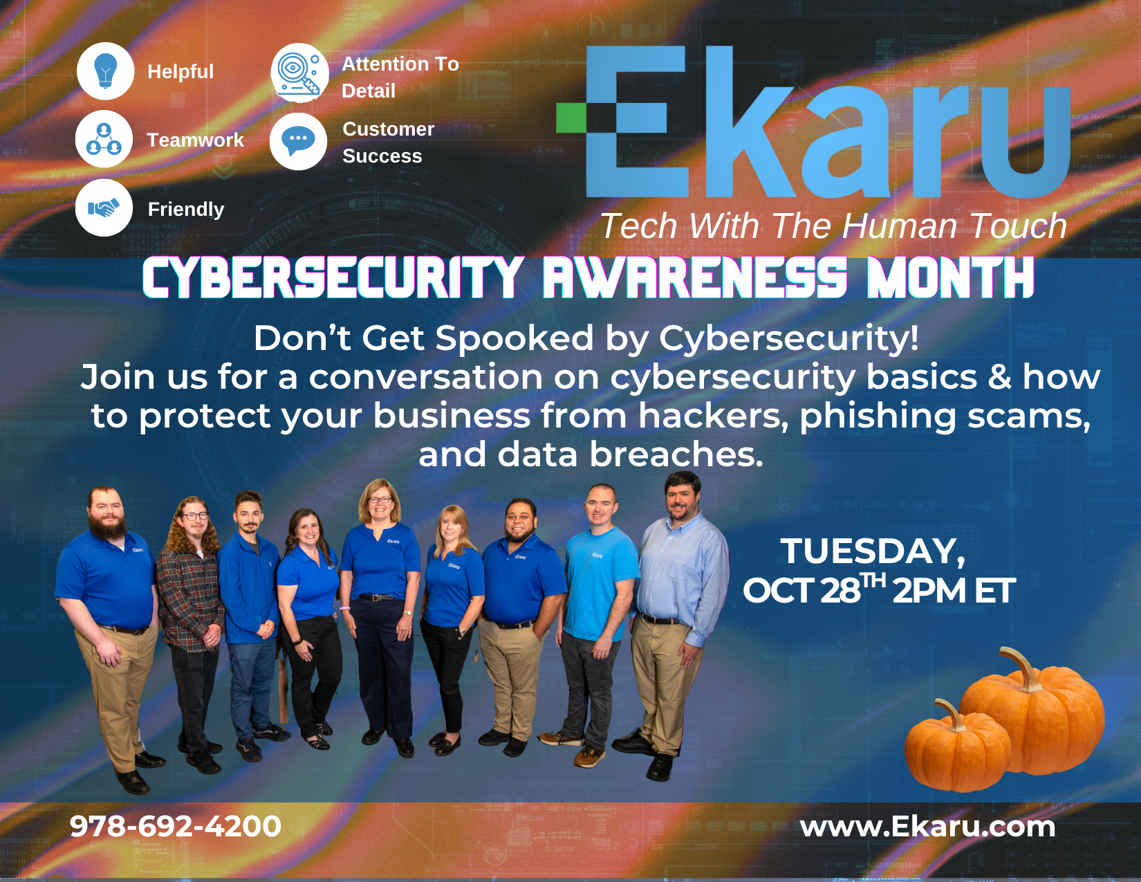 Join Ekaru for a workshop on Tuesday October 28th at 2pm EST. We're pleased to be bringing you the latest new info! Join us Tuesday to talk about "Don’t Get Spooked: Cybersecurity Doesn’t Have to Be Scary" Community and technology education are our strongest values, and a big part of our Ekaru mission.